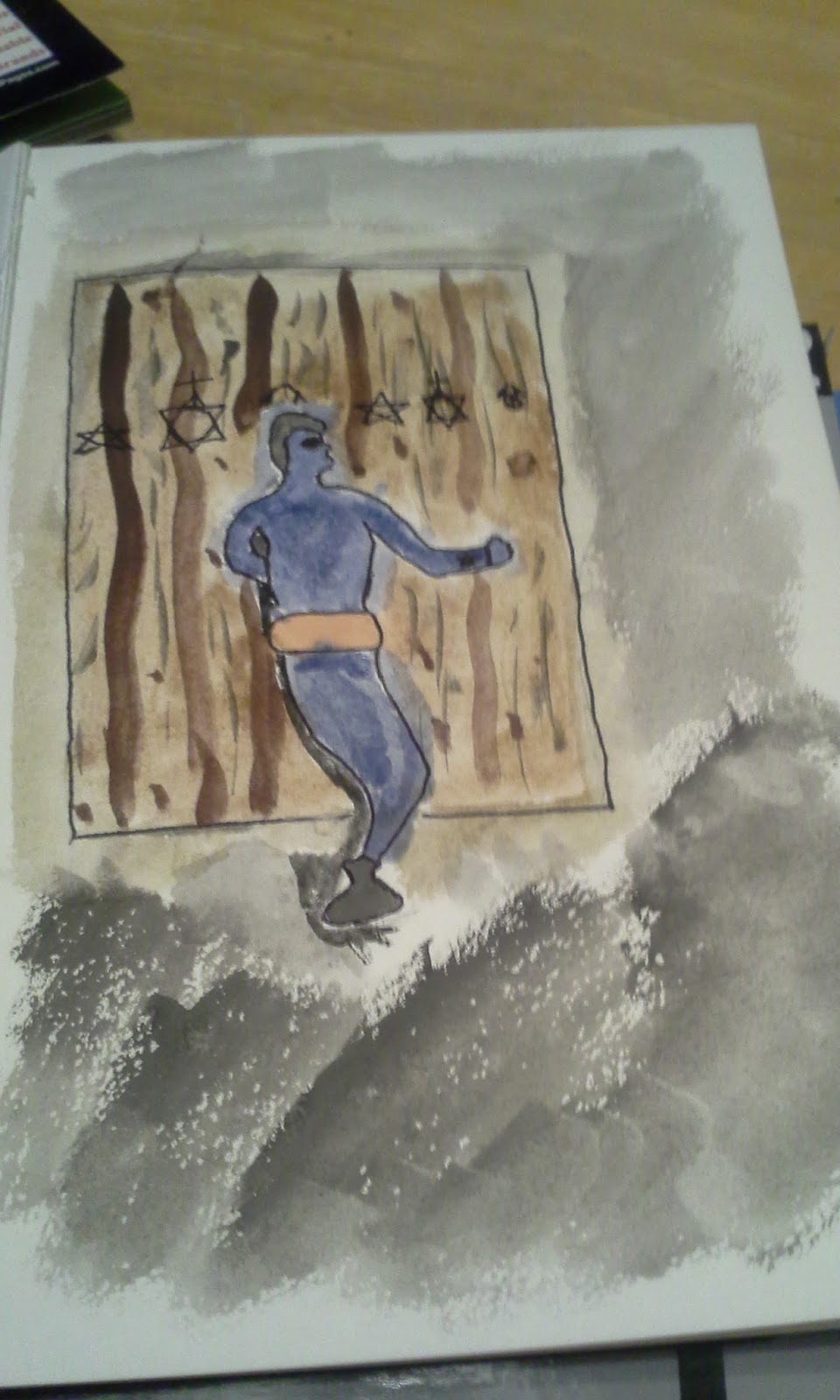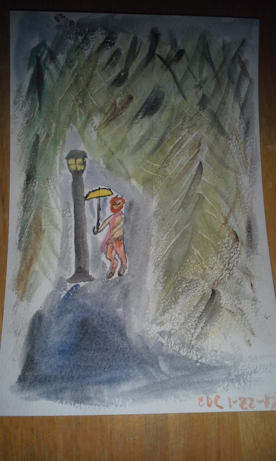 For Narnia, I discovered how truly terrible I am with eyes, and Tumnus ended up with sunglasses. o_O I did feel proud of my rendition of his legs, however. The background isn't half bad, and I was able to try my hand with the scraping textures again.