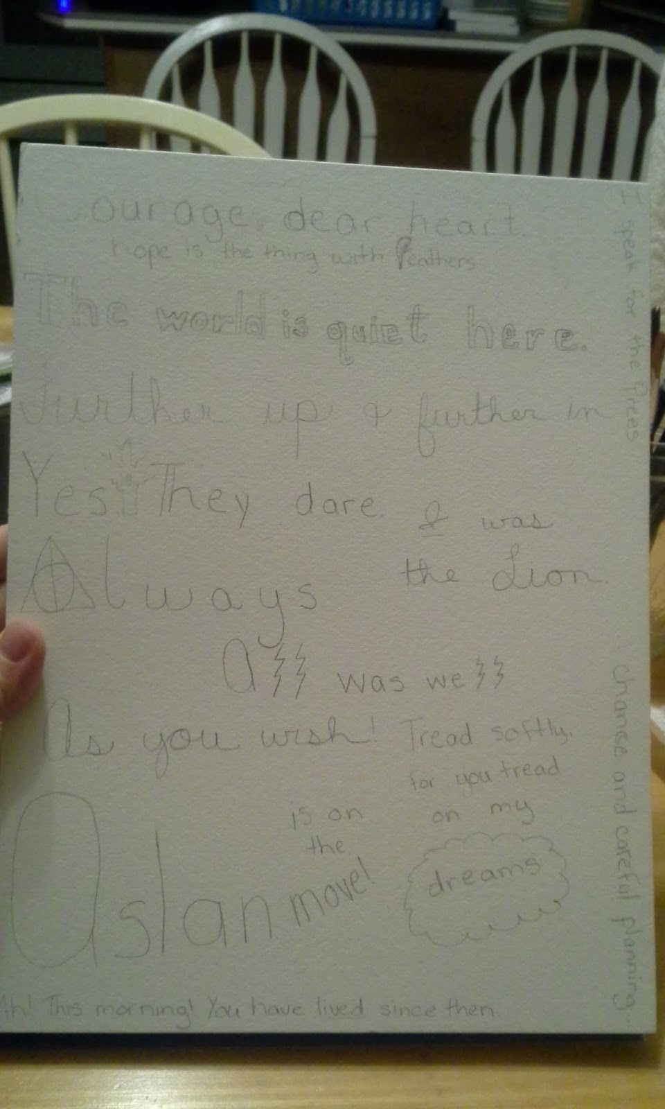 The quotes piece is one I've been muddling over for a while. It's something of a line and wash (wherein the subject is penned in with waterproof ink and then the paints are "washed" over the paper). I'll probably try for a more traditional line and wash next time. My favorite of the little designs on this piece is the Cheshire Cat, who turned out perfectly. I'm also fond of the spooky old tree in the Berenstain Bears quote and the slightly ethereal swooshes on "Always."