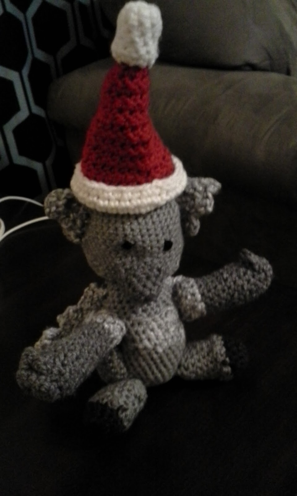A few years back, I misread the song title "I want a Hippopotamus for Christmas" as "I want a Hippogriff for Christmas" and this year, determined to make good on the increased awesomeness of my malaproped title, I crocheted myself a stuffed hippogriff (complete with Santa hat). Samwise, of course, declared it his almost immediately.