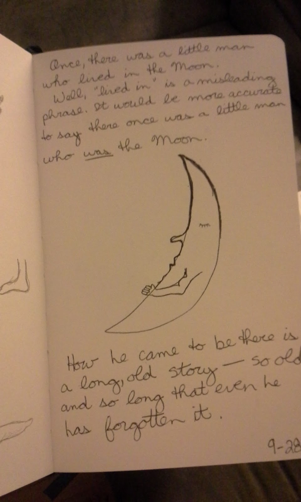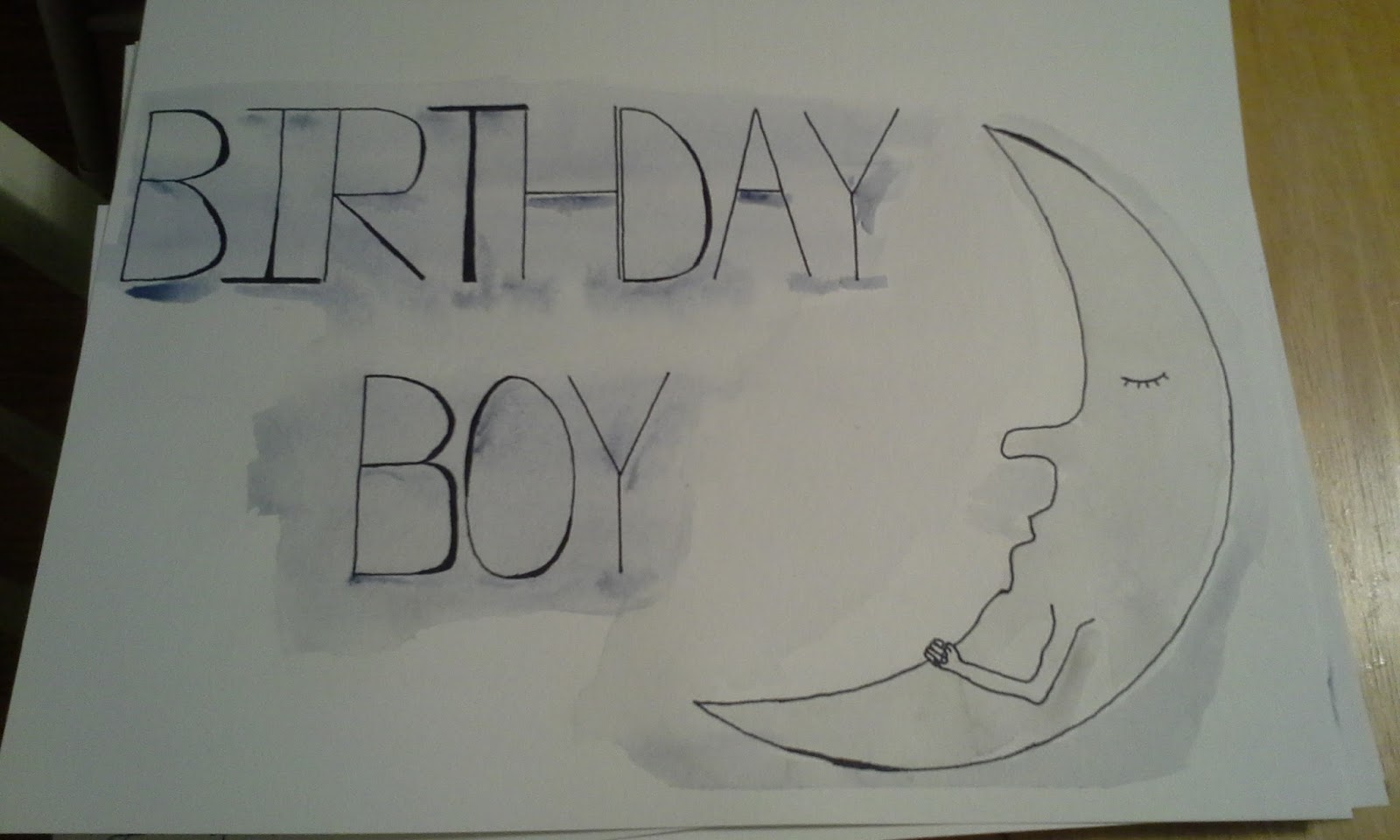 First up, another sign for Samwise's birthday later this month. The Man in the Moon sketch here is one I played with a few times this month, and a couple of other sketches of him were in Monday's sketch dump. (I also used this painting as a chance to play with transparency. It worked so well I'm not sure the picture actually captures all the color that's on the page.)