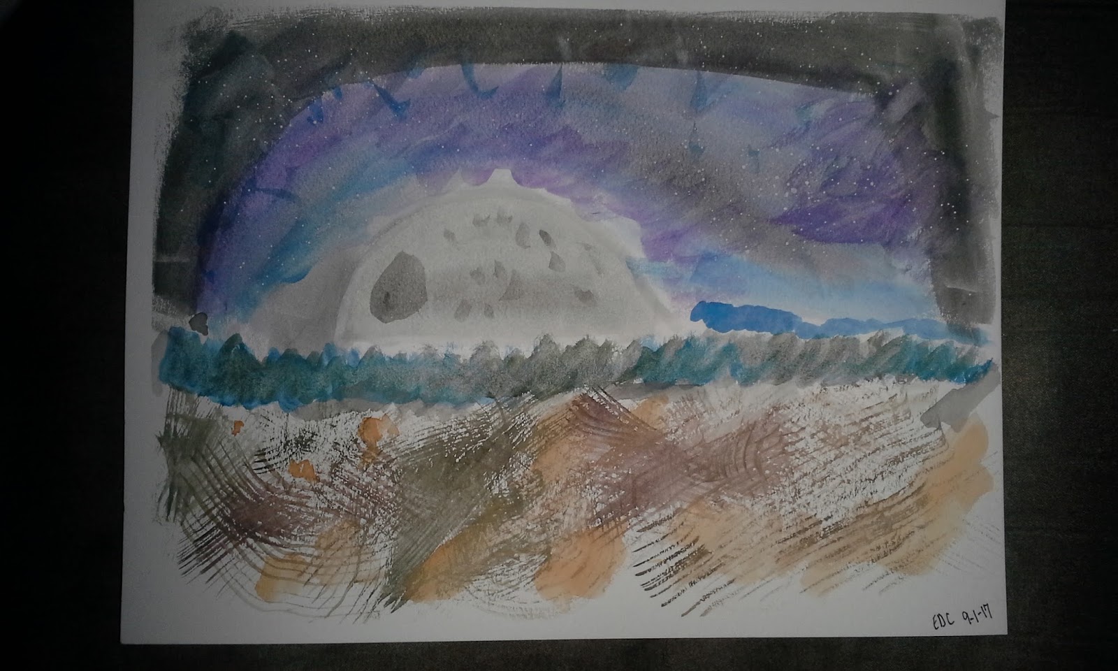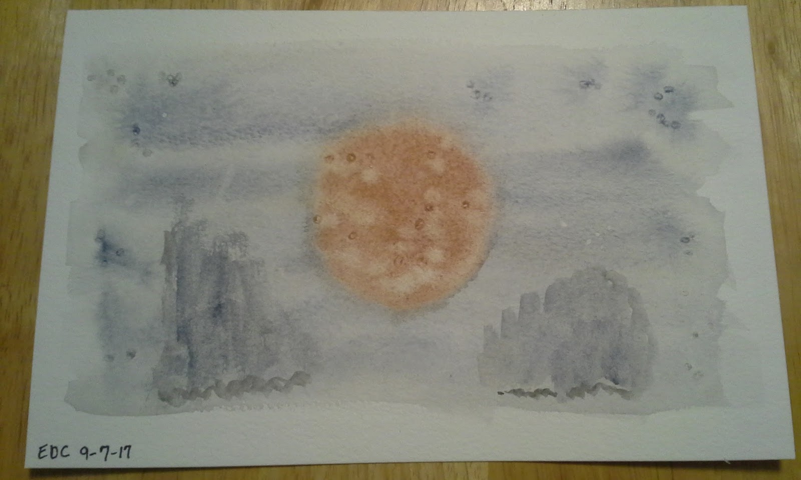 This was another moonscape where I tried to mix my colors on the page and work in some more texture with the trees. I definitely want to come back to the firs and try to do better with them.