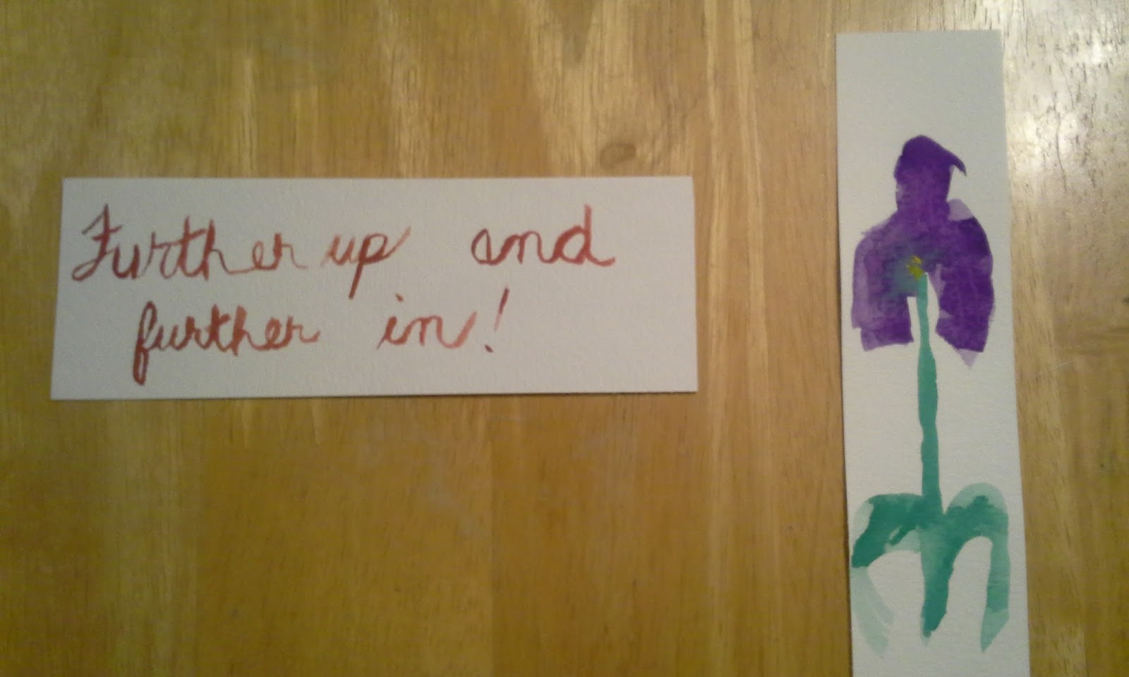 These two bookmarks were an experiment brought on by two factors. First, I ran out of my 5" x 7" (ish) watercolor paper, so I set to cutting up some of my larger sheets. Second, I cannot cut a straight line, so I broke out the paper trimmer, and the sheets were too wide for that even after I'd cut them in half, so I had to cut smaller strips off, resulting in these bookmark-sized pieces. The bookmark on the left is a classic quote from The Last Battle and the right bookmark is my first attempt at a floral painting.