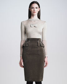 You’ll never go wrong with styles like simple sheath dresses or peplum dresses/skirts. You should wear more sophisticated and less flirty pieces keeping more of your skin covered; like below the knee skirts/dresses, crewnecks, soft collars and ¾ length sleeves. Avoid super sexy pieces when you go with a shorter dress or skirt, wear opaque tights to fill in all that bare leg and a knee-length boot or bootie.