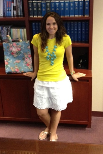 For those with more casual offices, Marie Schweitzer's outfit may be more your speed. She uses bold colors and a funky statement necklace to add flair—while keeping her necklines and hemlines in check, of course. For more from Marie on workplace fashion, check out her blog.