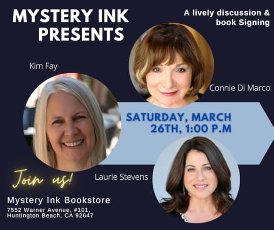 I’ll be with good friends Kim Fay (Love and Saffron) and Laurie Stevens (the Gabriel McRay thrillers) at Mystery Ink in Huntington Beach at 1:00 p.m. If you’re in the area, I hope you’ll stop by!