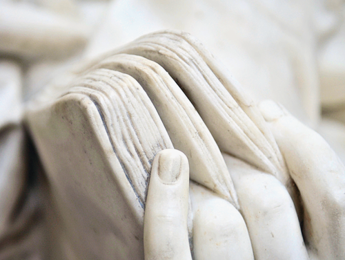 Statue of Lord Macaulay (1868, detail) by Thomas Woolner, in the chapel of Trinity College, Cambridge.