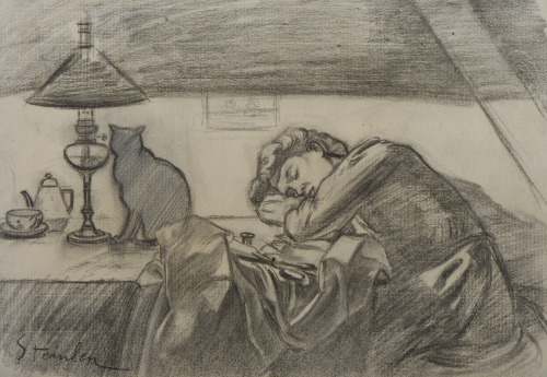 Théophile Alexandre Steinlen (1859-1923), Couturière endormie avec un chat sous la lampe.