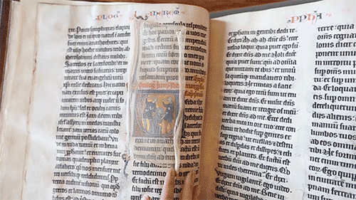 A silk textile curtain sewed into this 13th-century bible to protect the delicate gold leaf illumination of the Stoning of Jeremiah.