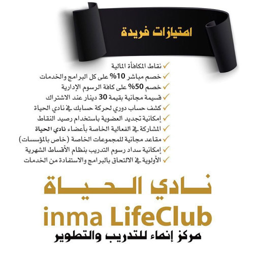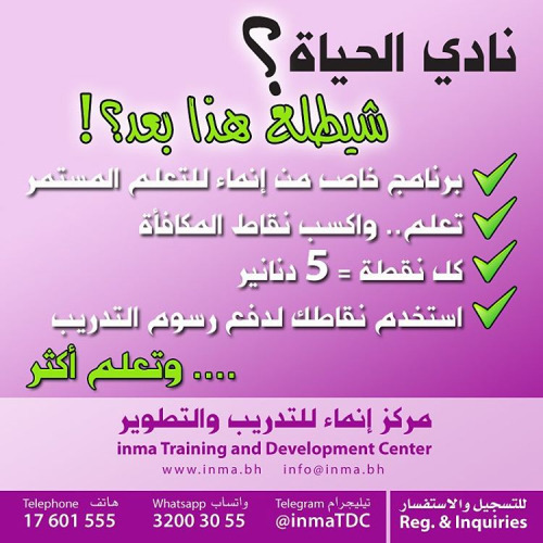 خصومات، برامج وفعاليات خاصة للأعضاء، الأولوية دوماً، إمكانية التقسيط، نقاط المكافأة، ورش ودورات مجانية… والمزيد.. فقط في #نادي_الحياة لدى مركز #إنماء للتدريب والتطوير - #البحرين