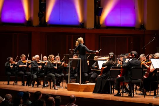 The conductor’s style of sweeping, balletic gestures signaled the mellifluous, fully layered sound she elicited from the orchestra, with careful attention to dynamics and inner lines, but nothing over-polite or smoothed over. New was particularly sympathetic to the wit and humor of Beethoven’s First and — abetted by the Benaroya Hall acoustic — emphasized a somewhat brighter sonority overall, with Alexander White’s trumpet part always clearly discernible. She aligned the double basses in a curious configuration on stage left, divided into two subsections stretching to the wall. I couldn’t quite notice a difference in the sound, but I assume it supported a particular balance she was looking for. New left a vivid impression of having something to say with this familiar rep, and I’m eager to hear more Beethoven from her.