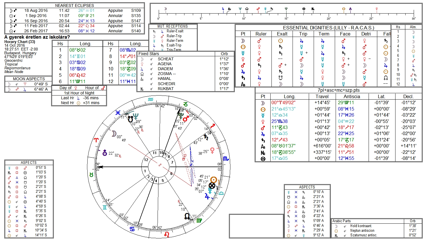 Konszideráció nincsen, tehát sem a Szaturnusz nem áll a 7-es házban, sem a Mars vagy a Szaturnusz a 10-es házban. Hold- Merkúr kvadrát, oppozíció nincsen és se nem korai, se nem késői.