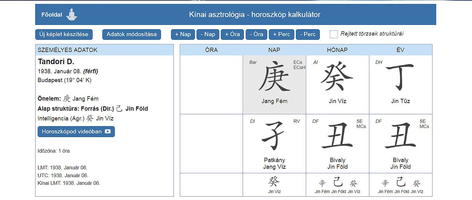 80 éves korában elhunyt Tandori Dezső (Budapest, 1938. december 8. – Budapest, 2019. február 13.) a Nemzet Művésze címmel kitüntetett, Kossuth-díjas és József Attila-díjas magyar költő, író, műfordító.Miután nem ismerjük a pontos születési dátumát, ezért próbáljuk meg kivételesen a kínai asztrológia eszközeivel megnézni a születési horoszkópját, mert azt lehet pontos óra, perc nélkül is elemezni