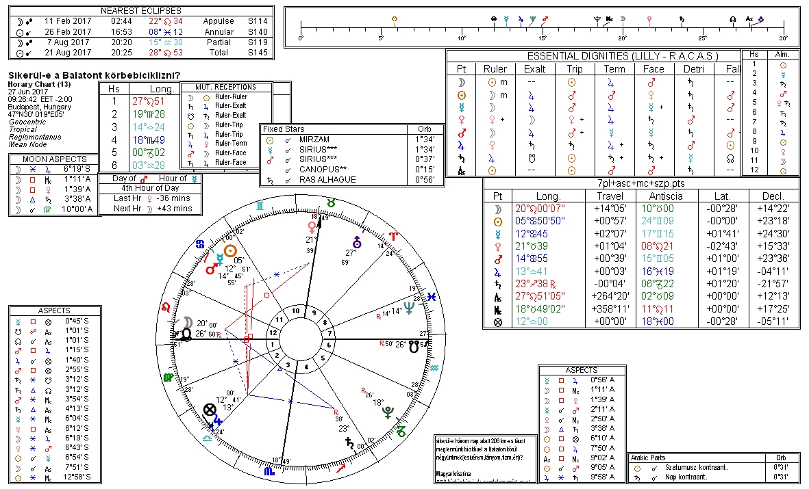 Óra ura: MerkúrASC ura NapÉrvényesség: Óra ura és ASC ura ugyanazon triplicitásbanJelölőkKérdező: Nap, HoldNyaralás: Szaturnusz (almutenje Vénusz) (5. ház)További szereplők:gyerekek: 1. Szaturnusz (almuten: Vénusz) 2. Szaturnusz (5. ház, 6. ház)testvér: Vénusz (almuten: Szaturnusz) (3. ház)A Kérdező egy peregrin Nap Rákban, 11. házban, követő házban. A Holdja, mint társura szintén peregrin, a 12. ház, sötét házban, hanyatló házban. Ebből már látszik, hogy közepes erőben van, és lelkileg szorong kissé az egésztől, ill. arra is gondol, hogy igazából szívesebben menne egyedül.