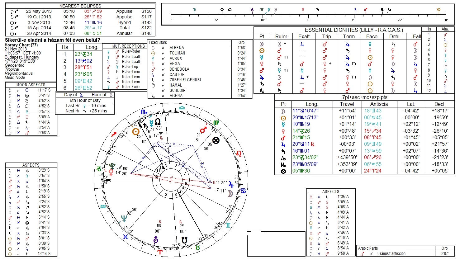 Nézzük meg a leendő vevőket, az lesz a Hold és a Nap. Ilyenkor jó – főleg párkapcsolatnál szokott lenni –, ha a 7. ház ura a Hold és a Kérdező társura is, mert akkor van egy lelki kapcsolat közöttük. A leendő vevőhöz valószínűleg nem akarunk hozzámenni, de azért nem árt, ha van egy ilyen lelki rokonság, könnyebben létrejöhet az üzlet. Könnyebben meggyőzhető a vevő, hogy vegye meg. Megnézzük, hogy tetszik-e neki a ház. A Hold a Rákban van, annak elég közömbös ez a ház, inkább az árra figyel, a Marsra. A Nap pedig az arculatában tartja a Vénuszt, a házat, látta már, volt már olyan vevő, aki ott járt és megnézte, azt látjuk. Annyira nincs elragadtatva a háztól, itt is inkább az ár játszik szerepet, a Nap is az árért van oda. Valószínűleg az a csábító benne, hogy nagyon olcsó.Tulajdonképpen ezzel feltérképeztük a keresletet és a kínálatot, igazából itt jön a döntő pont, hogy meg tudnak-e egyezni a felek. Miből látjuk, hogy sikerül-e eladni az adott időn belül? Egyszerűen, ha van egy adásvételi szerződés, az pedig mindig az 1. és a 7. ház között jön létre fényszöggel. Én még más lehetőséget nem nagyon láttam, bár vannak olyan horarys szerzők, akik más jelekből is levonják a következtetést, hogy eladják vagy nem adják a házat. Én ezt látom a legbiztosabbnak, ha létrejön a szerződés, ott az közeledő fényszöggel fog jelződni, attól függően, hogy könnyen jön létre vagy nehezen, könnyű vagy nehéz fényszögekkel kapcsolódik.