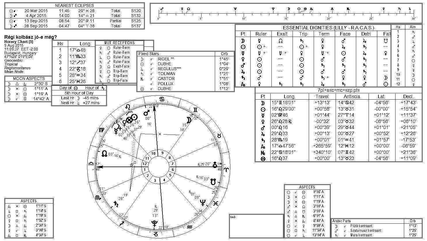 A Kérdező egy triplicitás szerinti Mars a 9. ház csúcsán. Elég jól ért hozzá, de tehetetlen és nagyon bízik az asztrológiában, épp azzal kutakodik. A Hold, mint társuralkodó, peregrin a Mérleg jegyében a 11. házban. Az ura után (domicil Vénusz) javul....Óra ura: JupiterASC ura: MarsÉrvényesség: recepció szerinti érvényesség (Mars a Jupiter egzaltációjában)Konsziderációk: Hold–Merkúr kvadrát (valami információnk még hiányzik a kérdés elbírálásához)JelölőkKérdező: Mars, HoldMobilok (2., 3., 4. ház): Jupiter, Szaturnusz, Vénusz