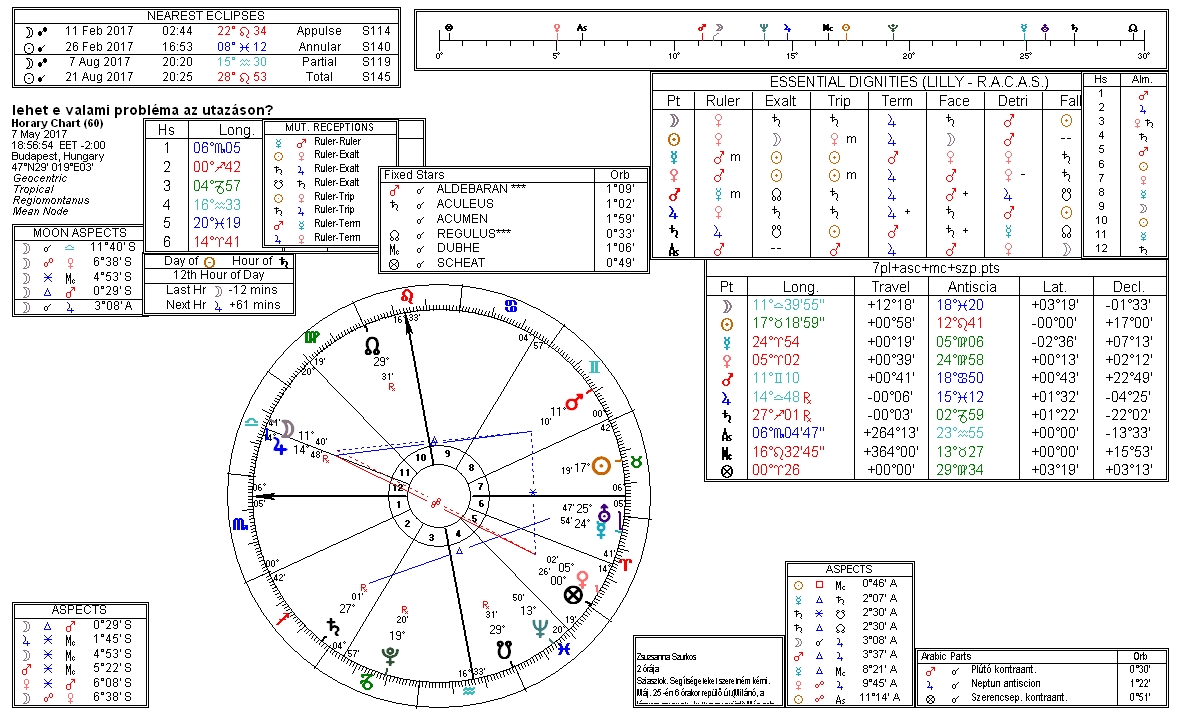 Óra ura: SzaturnuszASC ura: MarsÉrvényesség: a Mars a Szaturnusz triplicitásában áll, a kérdés érvényesKonsziderációk: nincs Szaturnusz vagy Mars a 10. házban, se Szaturnusz a 7. házban, se nem korai, se nem késői a képlet, nincsen Hold–Merkúr kvadrát vagy oppozíció, úgyhogy teljesen elemezhetőJelölőkKérdező: Mars, HoldUtazás (3. ház): Szaturnusz