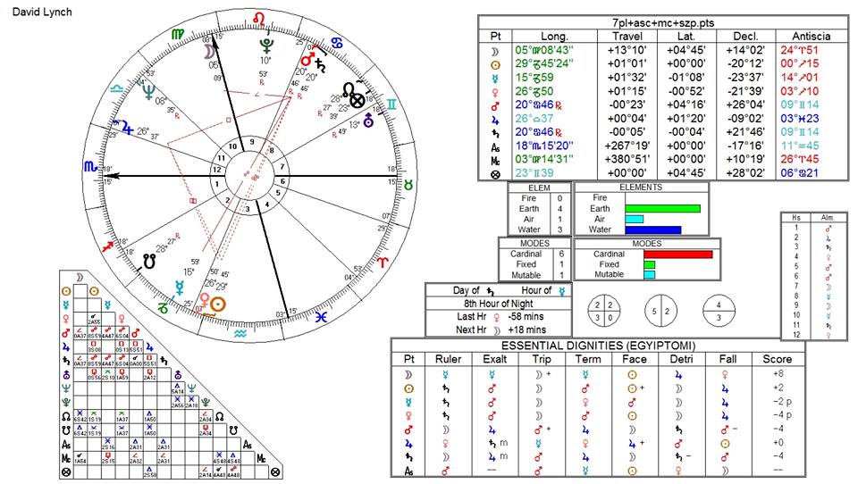 David Lynch január 20-án volt 73 éves.Arany Pálma díjas amerikai filmrendező, filmproducer és vizuális művész. A Veszett a világ, a Radírfej, a Kék bársony és a Dűne című filmek rendezője, a Twin Peaks televíziós sorozat megalkotója.Lynch Bak férfiú Skorpió Ascendenssel. Születési uralkodó Marsa valószínüleg a 8.és 9.ház határán a Rákban, együttállásban a Szaturnusszal, ami erőteljesen lesújtja. Emellett hiányzik belőle teljesen a Tűz elem életöröme. Nem véletlen hát a sötét, bizarr világlátása l. Twin Peaks, Radírfej, Elefántember. Ráadásul a Mars/Szaturnusz együttállása oppozícióban van a Nap/Vénusz együttállásával. Ahogy ő maga fogalmazta: