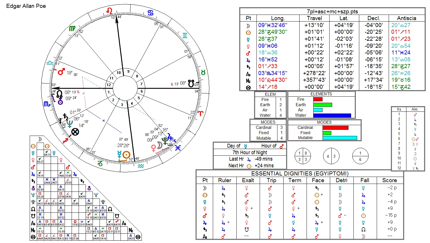 Halálának körülményei tisztázatlanok, az utcán találták meg félrebeszélve és 4 nap múlva meg is halt a kórházban anélkül, hogy bármire fényt tudott volna deriteni. Az idők folyamán Poe orvosi kartonja és halotti bizonyítványa is eltűnt.Ezt jelezheti talán a 8.h.ura a Merkúr a Naptól kombuszta, azaz "nem látszik" el van fedve, nem tudni mi történt. Poe halálának valódi oka ma sem ismert. Az egyik, 1872-ből származó feltevés szerint Poe halálát az okozta, hogy erőszakkal leitatták és több választási körzetben is szavazásra kényszerítették. Más elméletek szerint Poe halála delirium tremens, szívbetegség, epilepszia, szifilisz, agyhártyagyulladás, kolera vagy veszettség következménye volt. (azért ugye ez ganús, hogy mindez egyszerre nem lehetett).A 10.házának az ura a Nap (amely homályba borítja de egyben ki is domborítja halálát) egy arculati Nap. Életében nem voltak azért akkora sikerei, mint amekkora hatást később tett az irodalomra. A holló c. versét pl. csak 9 dollárral jutalmazták. Több magazinnak is a munkatársa volt, amelyek hol megszűntek, hol ő állt tovább.Ha viszont a halála felől nézzük a képletét, szépen látható, hogy népszerűsége és elismertsége maradt ill. csak nőtt a halála után.