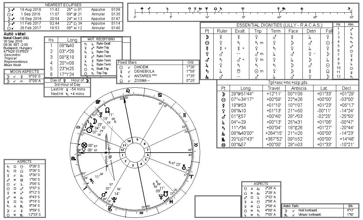 A Kérdező egy egzaltált Mars a 2. házban. Nagyon felindult és nagyon rá van kattanva a kinézett autóra, mivel annak uralma alatt van (de ezt jelzi a Plútó is, mint a rögeszmésség bolygója a 3. házban). Mivel a 2. házban van, az anyagiak is foglalkoztatják, van-e pénze az autóra?A Hold, mint társuralkodó peregrin a Szűzben, a 11. házban. Itt gondolhat a vágyaira, reményeire, ill. a bejövő pénzekre a vásárlás kapcsán.Az autó alapjáraton egy Szaturnusz, ami peregrin a Nyilasban és a 2. házban. Maga a Szaturnusz egyrészt jelzi, hogy használt autó lenne, másrészt a 2. házban anyagi nehézségeket okozna. A Szaturnusz a Vénusz terminusában van, a terminus pedig a külalakot mutatja, ez egy kifejezetten szép autó (mint kiderült, a kinézetébe, de főleg a színébe szeretett bele a Kérdező hölgy). Követő házban állva viszont megfelelne mindennapi használatra.