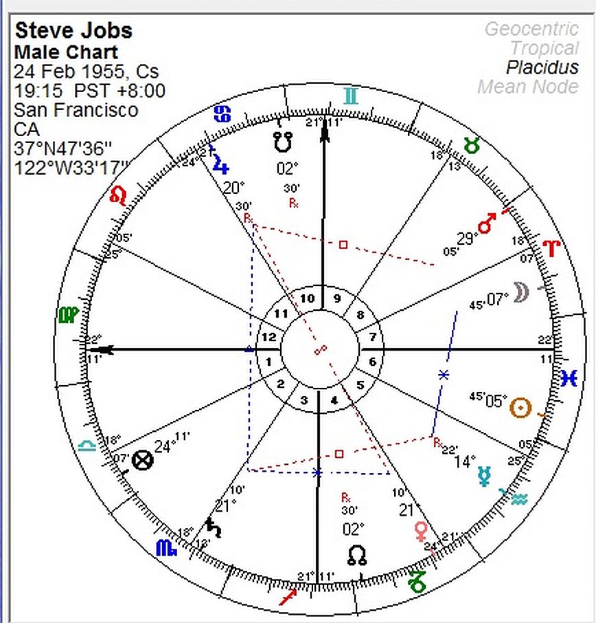 A Retrográd Merkúrja egyben a X.házának, a hivatás házának a jelölője is, ami egy vele, és éppúgy szakaszosan működik, mint ő maga: kezdett a blue-box-szal, aztán céget alapítottak az Apple-t, aztán eltávolították onnan és akkor belekezdett a NeXt vállalkozásába, majd a Pixarnál is vendégeskedett, és utána került vissza megint az Apple-hoz.