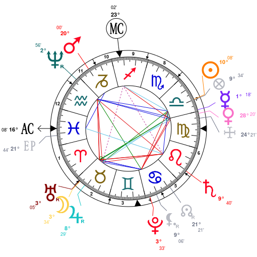 Születési ura a Merkúr retrográd a Vízöntőben, 5.házban, ahol van egy éjjeli triplicitása. Nagyon okos, elvont, absztraháló gondolkodása volt, de mindez szakaszosan, logikai bakugrásokkal, esetleg csak később nyilvánult meg a retrográdság miatt, ami levesz az erejéből, megnyilvánulásaiból. Ezenkívül a szilárd jegyű Vízöntő makaccsságot, önfejűséget, monomániát és befolyásolhatatlanságot adott neki.