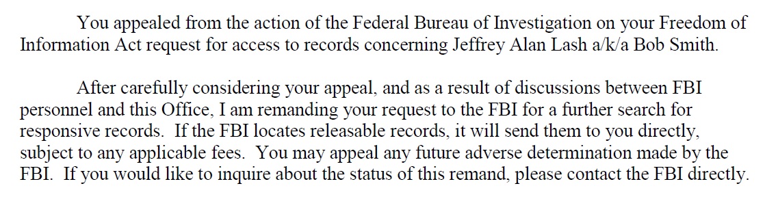 DoJ Responds to FOIA Appeal, Directs FBI to Search Further for Lash Files