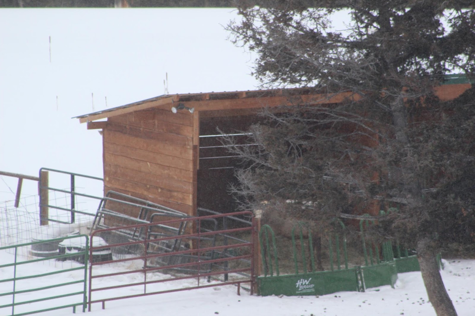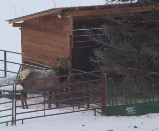 My horses, Wilson, Whiskey, and Star, didn't invite this fellow to supper. An elk jumped over the corral panels, pushed the horses away from their food, and went into the hay storage area, where he proceeded to try and eat everything in sight.