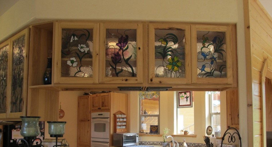 I have always been a fan of stained glass. Since I didn't feel I had the time, resources, or talent for it, I found a new way to achieve the same look of textured, colored glass, by mixing glazes, and hand painting the sheets of glass panels in my kitchen cabinets. Upon close inspection, it looks like cut glass soldered together.