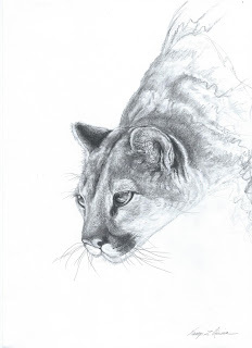 On the second floor of our home we have a large bedroom window that provides a grand view of the back of our property. While admiring the stars one dark evening the motion detectors suddenly activated the perimeter lights, nearly blinding us. Once our eyes adjusted, we saw standing in the middle of the yard a very large cougar. He paused only long enough to realize the brightness was nothing to fear before walking over to the swing set. This had me wondering how many times he had visited us before, unnoticed. He sat regally in the play area, surveying all about him, like a king overlooking his kingdom. Being a wildlife artist, I was enamored with his beauty and grace, temporarily forgetting what a potential threat he was to our family. It would be dangerous to allow him to believe this was part of his territory. I was about to comment on this fact to my husband, but when I turned to speak, he was not there, having immediately retreated to the closet. He ransacked it, searching for his rifle and ammunition. As he fumbled to load it, I continued to admire the feline in his pose. My husband opened the window, but was blocked by the mesh screen. As he tugged fruitlessly to remove it, the cat rose from his perch and began to walk toward the woods. On my last look at him, the cougar, who seemed completely unaware of the flurry he had created only a short distance above, slowly and confidently sauntered into the tree line, still secure in the knowledge that this world was his. We tried to follow his movements through the darkness with a flashlight, but the battery soon died. My increasingly frustrated husband, incensed by the attitude of the beast, rushed downstairs and out onto the patio where he fired a single shot into the air, then shouted, “And stay out!” as a warning for the puma not to return. I have no wish to harm this mountain lion or capture him, except in spirit on canvas and paper. I have handled many cougars in captivity, but seeing them in the wild is a thrill I will never tire of. For more stories in our western adventure read “Go West, Young Woman!” https://www.amazon.com/Go-West-Young-Woman-Military/dp/1555718299?ie=UTF8&ref_=asap_bc