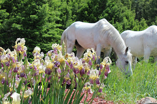Our 20 year old quarter horse gelding named Wilson, is so proud of himself. I watched him cautiously tip toe through the Iris flowers. He has learned to open the safety latch on the corral gate and let himself into the garden. His companion is never far behind. They love to take a walk and graze as they make their way to the house to ask for hugs and cookies at the front door.