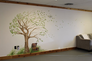 I was commissioned to design and paint 2 wall murals for a local business. The first design spanned a 14 foot wall, and features a treasure chest hidden in the grass. I mixed some glitter in the gold paint I used for the coins. When the sunlight hits it- it really does glitter like gold. I also placed some tiny ladybugs and inchworms in the artworks too, it's fun to find them among the leaves.