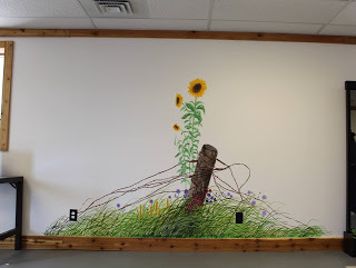 The second wall directly across from the tree mural, featured a fence post with old barbed wire, it is about 11 feet in length. I used the same gold glitter to place some highlights into the yellow flowers. Magical!