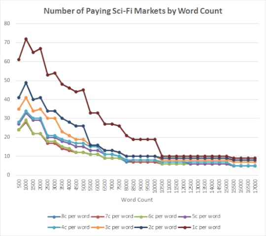 As a starting point, I wanted to know how many markets there were, by both word count and rate of pay. For markets that publish sci-fi, whether exclusively or not, the answer is this: