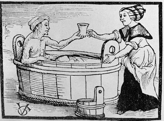 It was while I was happily soaking in the bath last night that I got to wondering about baths and hygiene in Tudor times – and what it meant to different levels of society. There’s this perception, perhaps, that people in the Tudor period were generally dirty, and that hygiene was not high on the list of priorities. To a certain extent, our visual media plays on this – either stretching our credibility with costume dramas showing impossibly beautiful people in impossibly pristine clothes (think BBC’s The Tudors), or presenting horribly grubby peasants in horribly filthy clothes (think Monty Python). We have also been fed this regular myth that Tudors thought bathing unhealthy; for example that even Elizabeth would bathe infrequently. I have not seen evidence of this; and she would have had access to the lavish bathrooms built in the main palaces by her father Henry VIII, so I think it much more likely that she bathed regularly.
