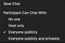 Teachers can use the chat to engage students during a Zoom lesson. You may need to save the chat to assess student answers, or to capture some inappropriate behavior.