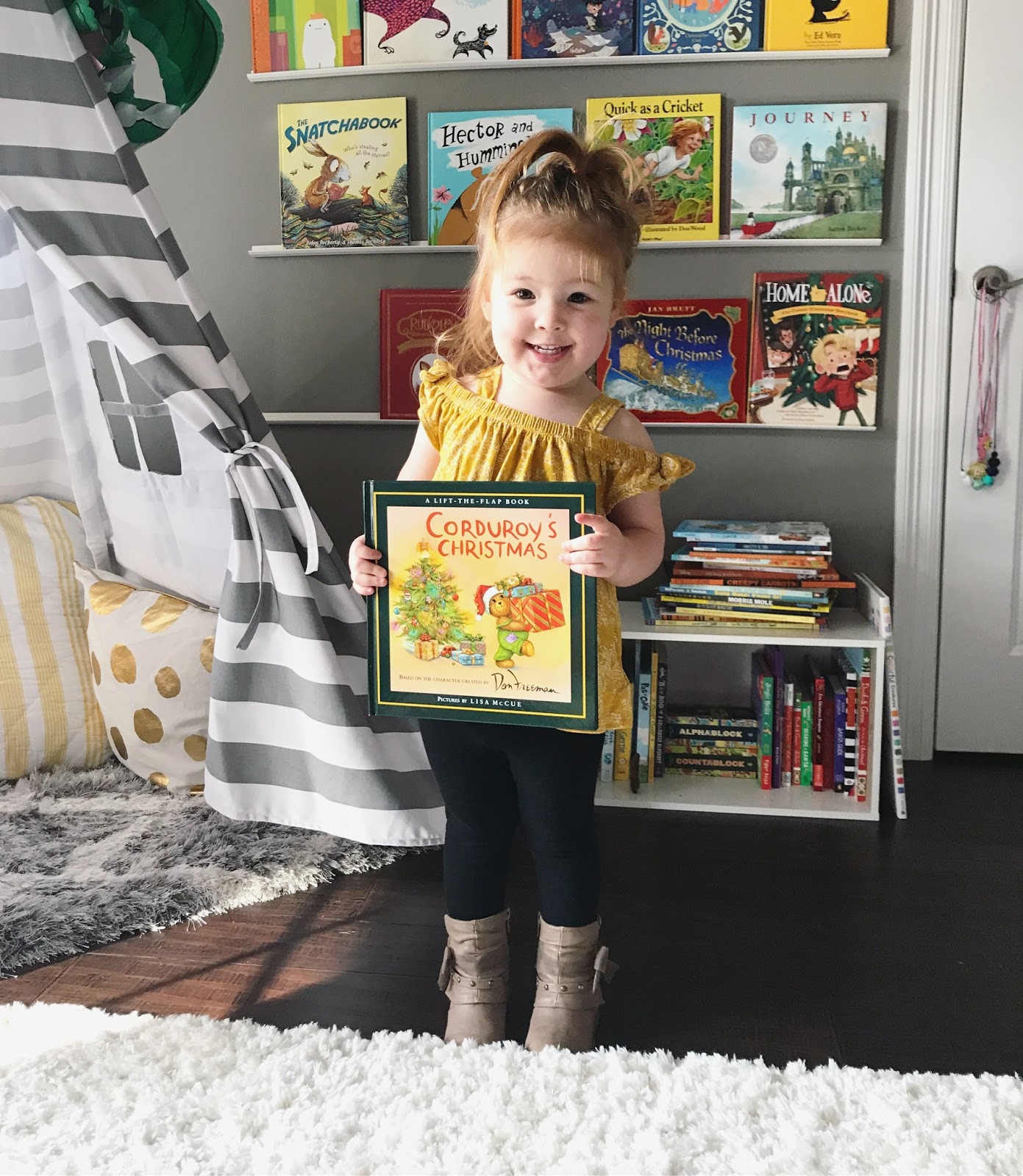 This is a character from a story I loved when I was younger, so I'm happy that she enjoys this one. Do I wish she would mix it up a bit more? Yes. But it's definitely a cute and easy read. The advantage to it when you have to read it a million times in a row is that there are variations you can easily make to mix up the story a bit for each page. We sometimes eat the cookies Corduroy bakes on one of the pages, or sing along with the carolers on another!