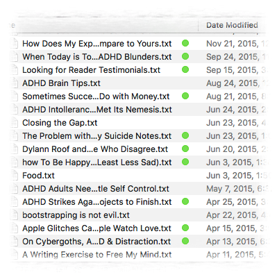 I’ve recently made a goal of tagging all my published blog articles so I can see which ones haven’t been published. OS X allows me to tag files with colored dots. That way all the untagged files will stand out. OS 9 used to allow the entire filename to be colorized so that it would shout out at me from the din, but now we are living in the future where small dots of color are considered more noticeable than one inch long filenames in pulsating bright green. Regardless, now that I’ve slogged through the past three years of posts, I have discovered an alarmingly high number of posts that never saw the light of day. It’s as if some unnamed power gripped my mind and caused me to wander off. I wonder if there’s a name for it…