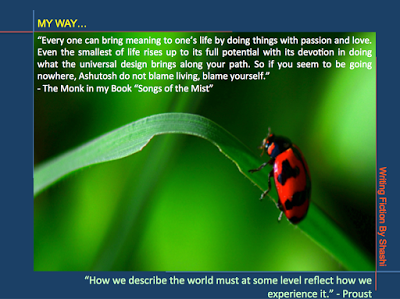 And over the period of my own journey towards writing my books – The Monk Key Series – first of the three part series is already published as “Songs of the Mist”, in which the Monk says to the protagonist Ashutosh, “Every one can bring meaning to one’s life by doing things with passion and love. Even the smallest of life rises up to its full potential with its devotion in doing what the universal design brings along your path. So if you seem to be going nowhere, Ashutosh do not blame living, blame yourself.”