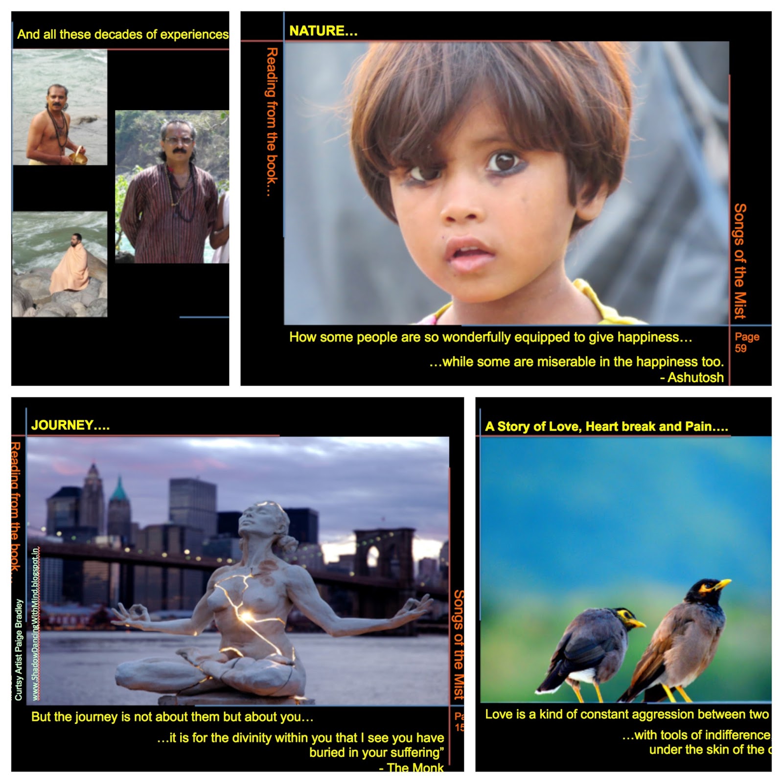 This coffee table book has all the 9 songs of the Monk from my book “Songs of the Mist” as well as some of the Haiku and thoughts from the book. The book’s cover page is by famous cartoonist of Hindu, Mr. Keshav -one of the finest Krishna Bhakta, I have come across in Chennai. The book is conceptualized by Krishan Kumar Sharma, which includes Photographs by Goutam Chakraborty, Suresh Thommandram and some of my pictures as well.