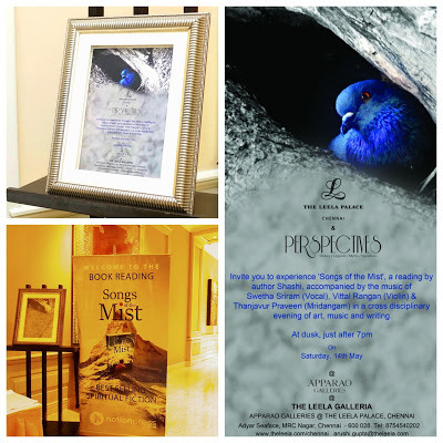 The Leela Palace Hotel and Perspectives along with Apparao Gallery created an evening of “Art, Music and Writing”, on 14th May, 2016. In the program, I was invited to give my readers an interactive experience to my book “Songs of the Mist” – a reading of the Book, accompanied by the music of Swetha Sriram (Vocal), Vittal Rangan (Violin) and Thanjavur Praveen (Mridangam).