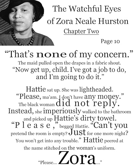 The maid still didn’t reply, but was obviously agitated and nervous. She started spraying cleanser on the sink, ignoring Hattie. A thought whirled through Hattie’s mind. “Zora is a strange name,” she mused, momentarily distracted from her troubles. “I’ve heard it before. There’s a Negro writer named Zora. Zora… Neale Hurston. Have you heard of her? Do you read?”