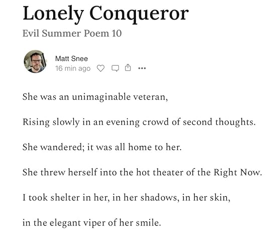 I’ve decided to (slowly) release my poetry chapbook “Evil Summer” on my new Substack in the section entitled Poetry Pill. It can be found here: