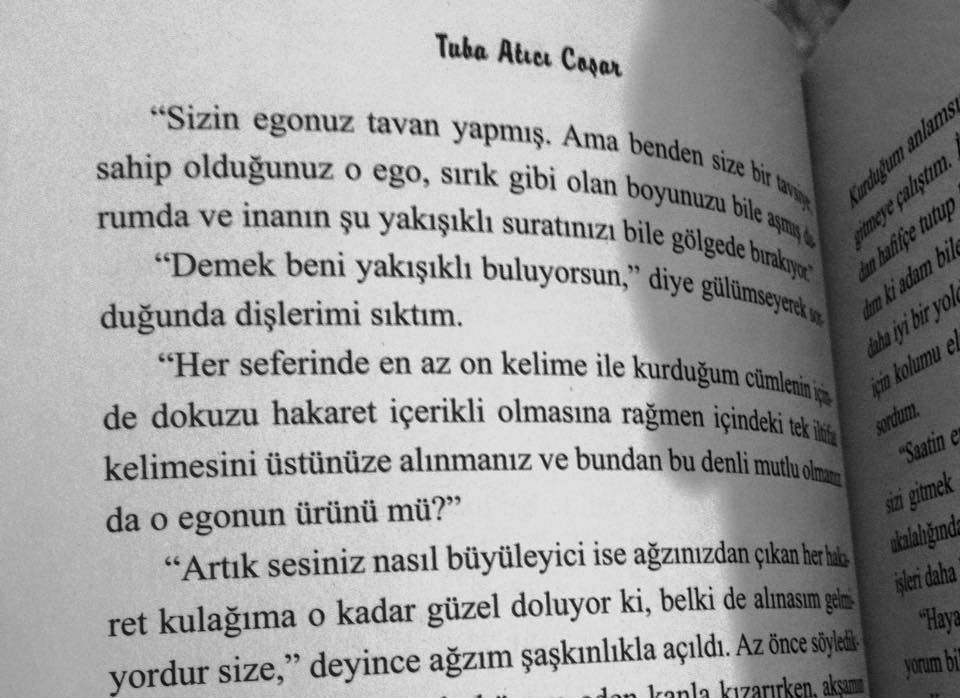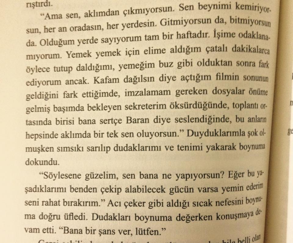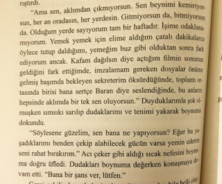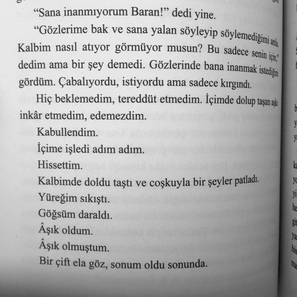 Tam Türk filmi tadında bir kitaptı. Yalan, dolan sert erkek, naif kız, mecburiyet... Son dönemde hiç sevmediğim halde kitapları yarım bırakıyorum ama bu kitapta öyle olmadı. Okudum bitirdim. Ara sıra havada kaldığını düşündüğüm noktalar olmadı değil. Sanki böyle yazar anlatırken bir kapı açmış ve bölüm sonunda daha biz odanın içini tam olarak anlayamadan kapıyı kapatmış gibi. Yani kitabı beğendim evet, bir ilk kitap olarak son dönemde çıkan pek çok kitaba göre iyiydi. Klişe doluydu ama artık alıştık :D Kitabın en çok sonunu sevdim, gözlerim doldu. Ama size o kısmı söylersem spoiler olur diyemiyorum :( Bence kitabın o şekilde bitmesi en iyisiydi, öyle bitmeseydi bu kadar hoşuma gitmezdi sanırım. Manyak mıyım neyim ya :D