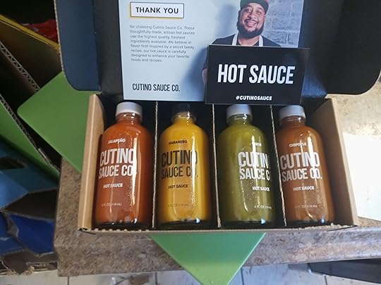 Another superfan, who remains clothed when reading my stuff, as far as I know, is Ivan. Even so, that didn’t stop him from sending me a box set of hot sauces (image below). The, Phoenix based boutique company, Cutino’s Hot Sauces, makes a variety of hot sauces which are an absolute joy on your tongue. And mine!