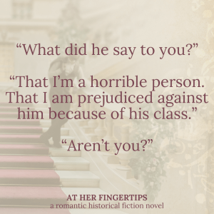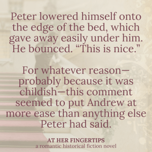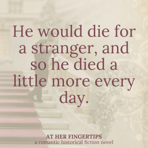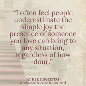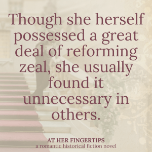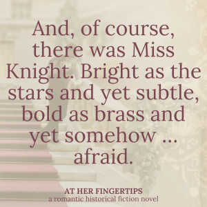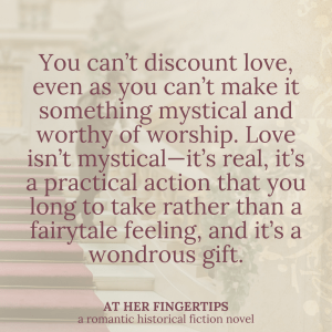 Yet At Her Fingertips is one of the novels that felt like it was most full of themes. Themes of bravery, themes of following God’s guidance (even if that guidance is “cease and desist!”). Themes of valuing love, and yet not making it one’s idol.