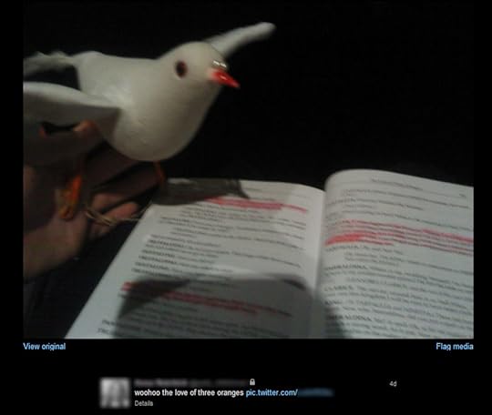 If you can’t make it out, it’s a tweet and photo from an actress in an upcoming school production of The Love of Three Oranges showing off both her script (with Princess Ninetta’s lines highlighted) and...