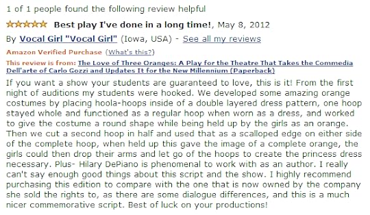 I don’t have a lot ofoccasionto look at the Amazon page for The Love of Three Oranges since copies are no longer sold there. When I did happen to glance at it recently (mostly because I was trying to figure out how people get off selling copies for $300+ when they are much less over on Playscripts) I noticed this really wonderful review I’d never seen before.