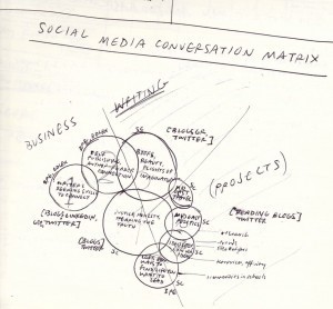 To put it a better way, figure out which online conversations you care about, and establish a presence wherever those conversations happen. I got ahead of the course last week, because not only did I obsessively compel those conversations into a diagram (see right), I picked out Goodreads for its connection to passionate readers; Twitter for its wide reach and popularity among savvy writers and publishing industry pros; and blogs (both reading others' and writing more here), using Google Reader to follow them.