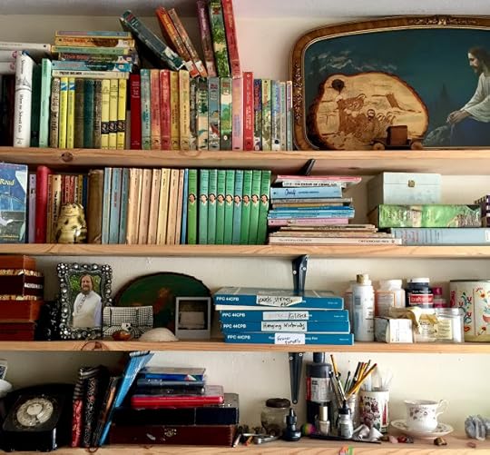 There are a few art supplies stored here, but these shelves are mostly crammed with things that I love: like my old Cherry Ames, Nancy Drew, and Trixie Belden books. Lets not forget Laura Ingalls and Anne Shirley!