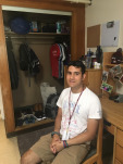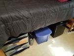 Underneath my bed is a plastic dresser with my hockey equipment, two trash cans, a blue bin of snacks, and a black mini-fridge with lots of water in it. There is also a power strip which powers my phone at night and my fan 24/7, which rests on the window ledge.